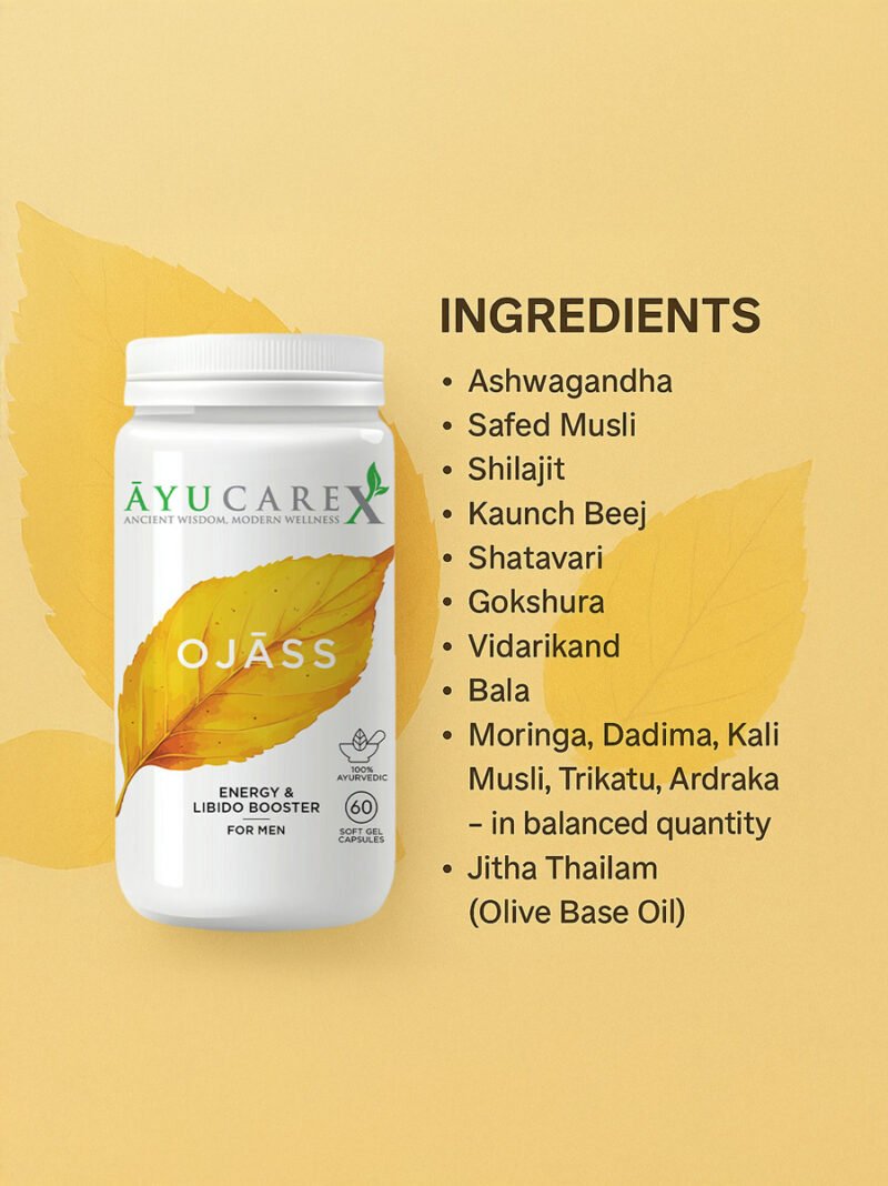 OJĀSS is crafted specifically for adult men experiencing low libido, reduced passion, or energy imbalance due to stress, age, or lifestyle factors. Curated by Dr. Subhash Dhawale after years of treating emotional and physical fatigue in men, this blend helps restore ojas — the Ayurvedic essence of male vitality.