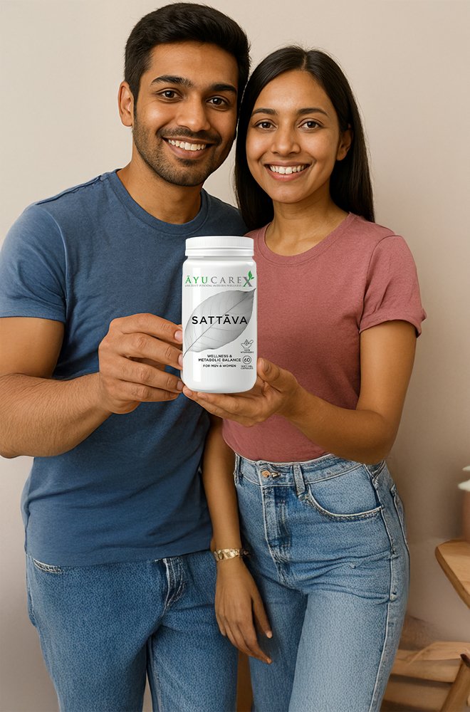 SATTAVA is a daily Ayurvedic wellness formula created for both men and women, designed to support energy levels, metabolic balance, and overall vitality.