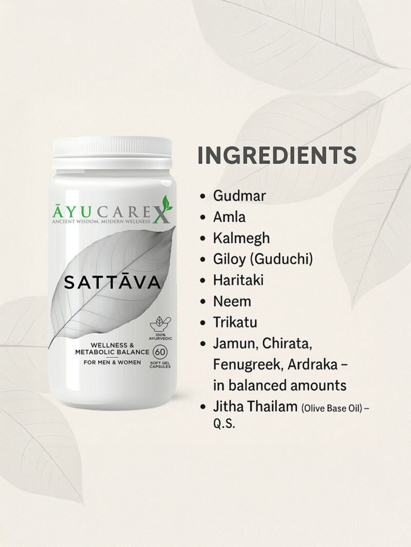 In a fast-paced lifestyle, fatigue, imbalanced sugar levels, and sluggish metabolism can silently affect your health. SATTAVA is formulated to restore daily energy and inner balance through a blend of Ayurvedic herbs traditionally used to support digestion, blood sugar control, liver health, and immunity.