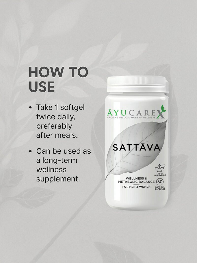 SATTAVA is a daily Ayurvedic wellness formula created for both men and women, designed to support energy levels, metabolic balance, and overall vitality.
